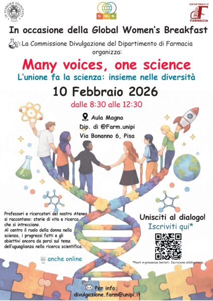 In occasione della Giornata Internazionale delle Donne e delle Ragazze nella Scienza, la Commissione Divulgazione del Dipartimento di Farmacia – Università di Pisa è lieta di annunciare la seconda edizione del Global Women’s Breakfast (GWB) locale, dal titolo: “L’unione fa la scienza: insieme nelle diversità @Farm_UNIPI