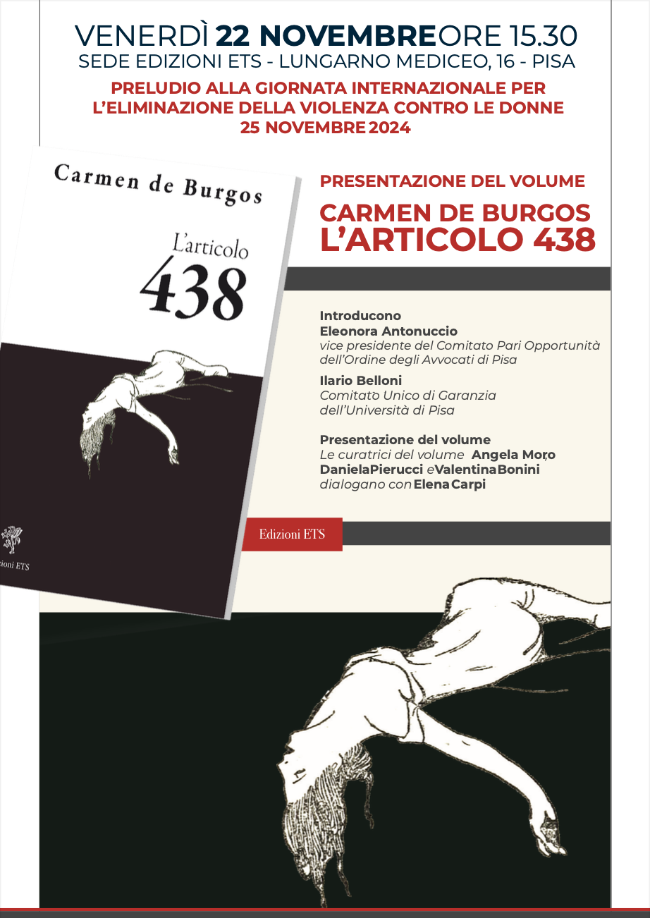 Venerdì 22 novembre, alle ore 15.30, presso la Sede della Casa Editrice ETS (Lungarno Mediceo 16), avrà luogo la presentazione del volume dal titolo “L’articolo 438”, traduzione di un romanzo breve del 1921 di Carmen de Burgos (Almería, 1867 – Madrid, 1932).