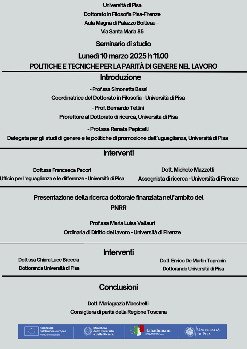 Lunedì 10 marzo 2025 alle ore 11.00 avrà luogo presso l’Aula Magna di Palazzo Boileau (Pisa, via Santa Maria 85) il seminario … Leggi tutto Politiche e tecniche per la parità di genere sul lavoro…